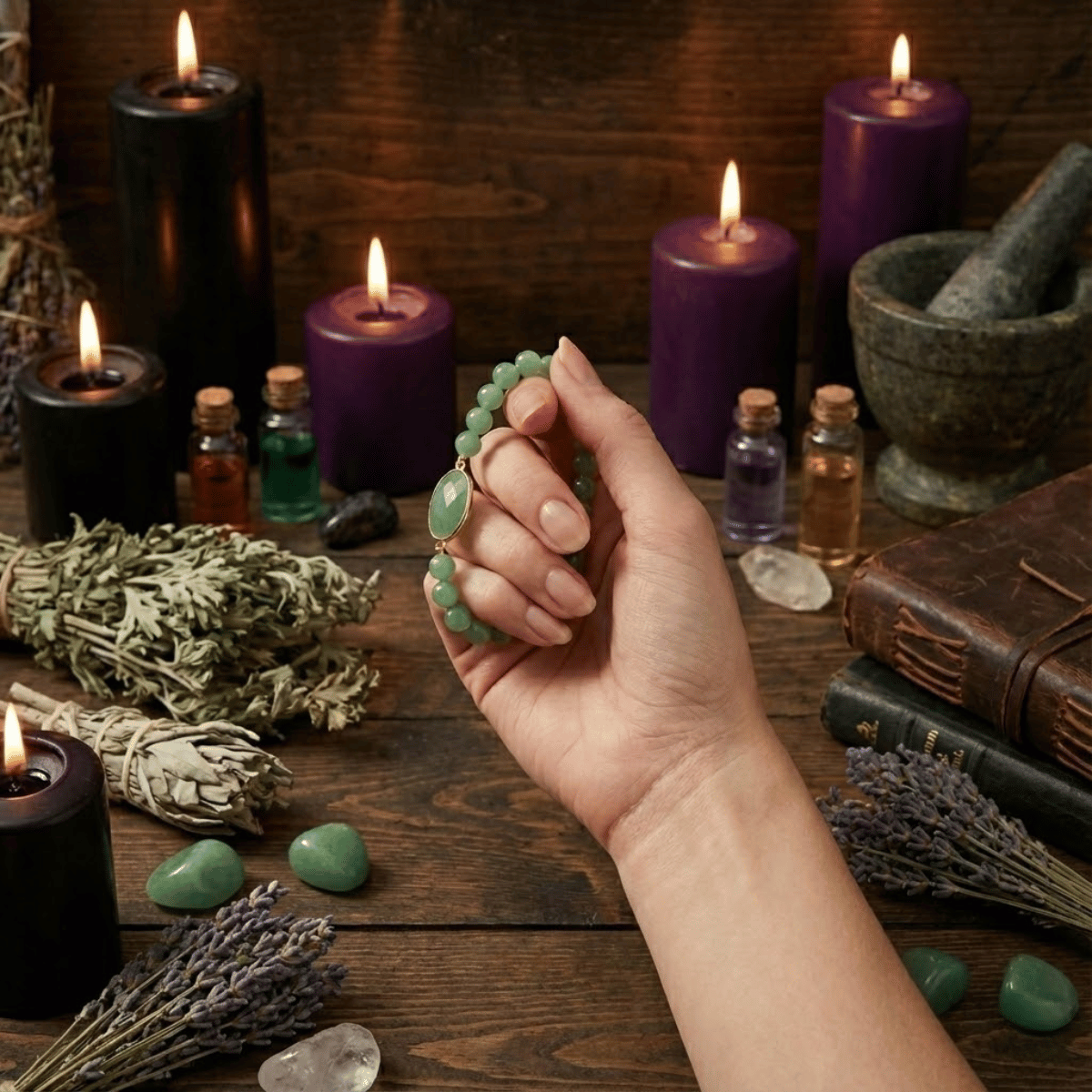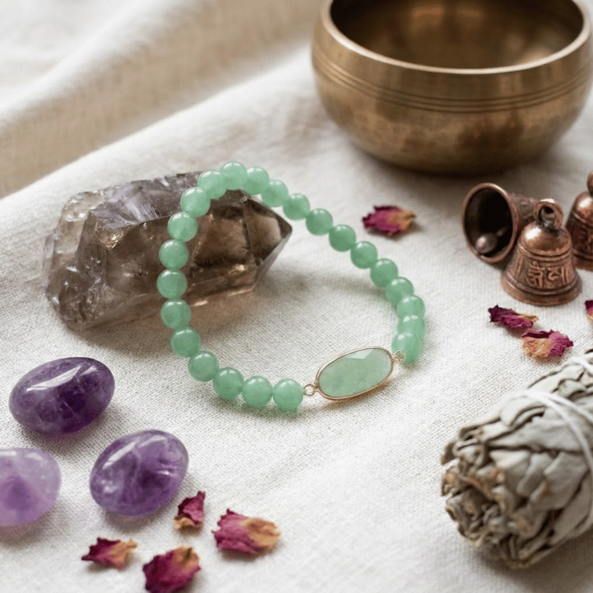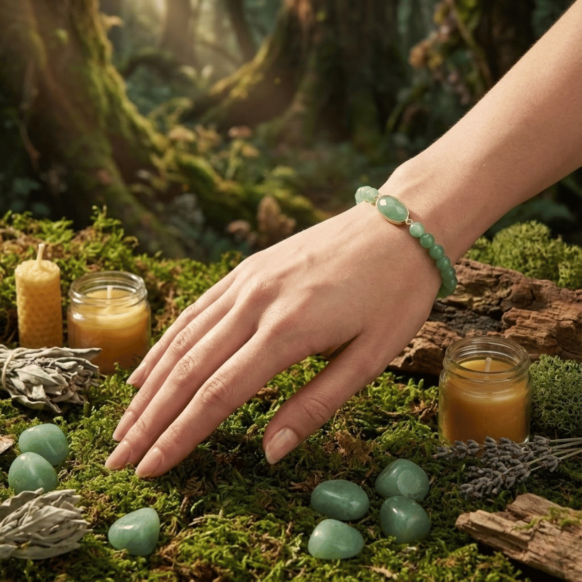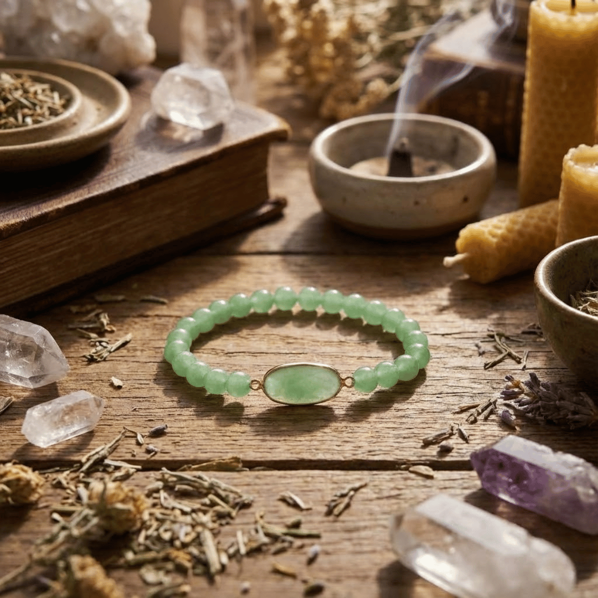 Praca energetyczna odbywa się tu w sercu – dosłownie, w Czakrze Serca. Duży, płaski kamień w centrum bransoletki działa jak tarcza i emiter jednocześnie. Zielony awenturyn otwiera Czakrę Serca na przyjmowanie. Wiele kobiet potrafi dawać, ale ma blokadę przed braniem. Ta bransoletka usuwa ten opór. Uczy, że pragnienie dobrobytu jest aktem miłości do samej siebie.