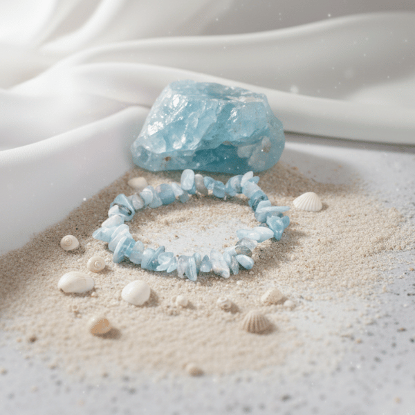 Bransoletka z akwamarynu na gumce to elegancki i subtelny dodatek, który nie tylko przyciąga wzrok, ale także wspiera w zachowaniu wewnętrznego spokoju i jasności umysłu. Akwamaryn, znany jako kamień odwagi, harmonizuje emocje, wzmacnia intuicję i pomaga w wyrażaniu prawdy.