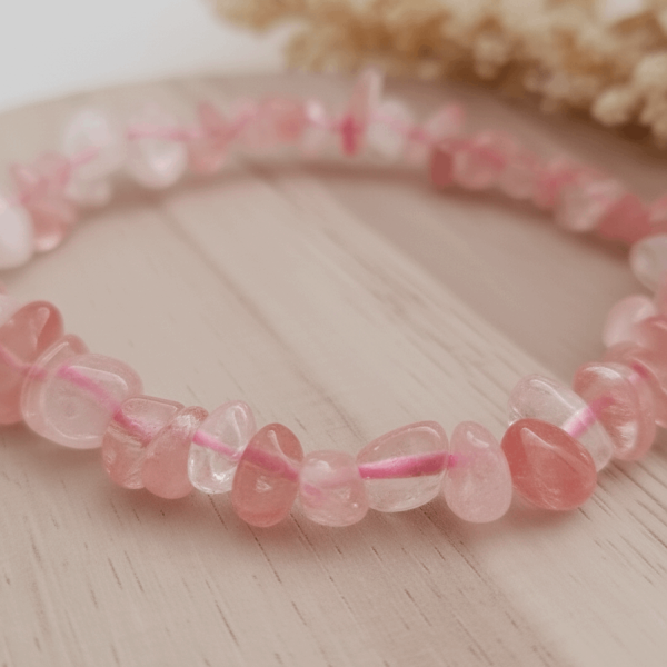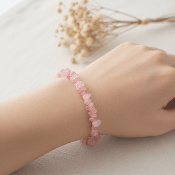 Noszona na nadgarstku bransoletka z kwarcu truskawkowego wspiera harmonię w relacjach i rozwija wrażliwość. To kamień, który otwiera serce na miłość – zarówno tę romantyczną, jak i miłość do samego siebie – wzmacnia aurę i dodaje odwagi w wyrażaniu uczuć. Pomaga zachować pogodę ducha, wzmacnia optymizm i sprawia, że łatwiej jest przechodzić przez codzienne wyzwania z lekkością.