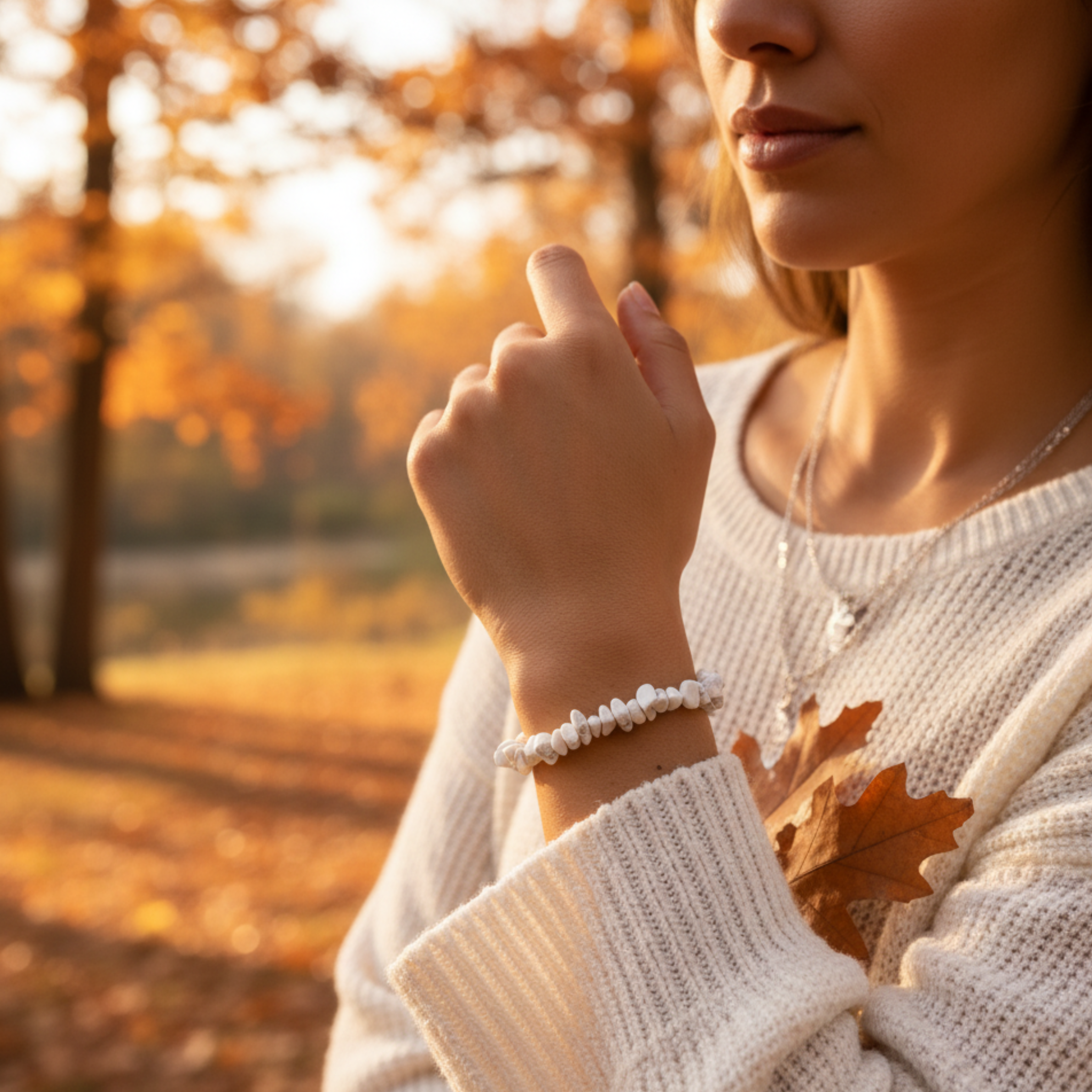 Nasza bransoletka z magnezytu to nie tylko piękna ozdoba, ale także talizman wewnętrznej równowagi, który przypomina, że prawdziwy spokój zawsze zaczyna się w sercu.