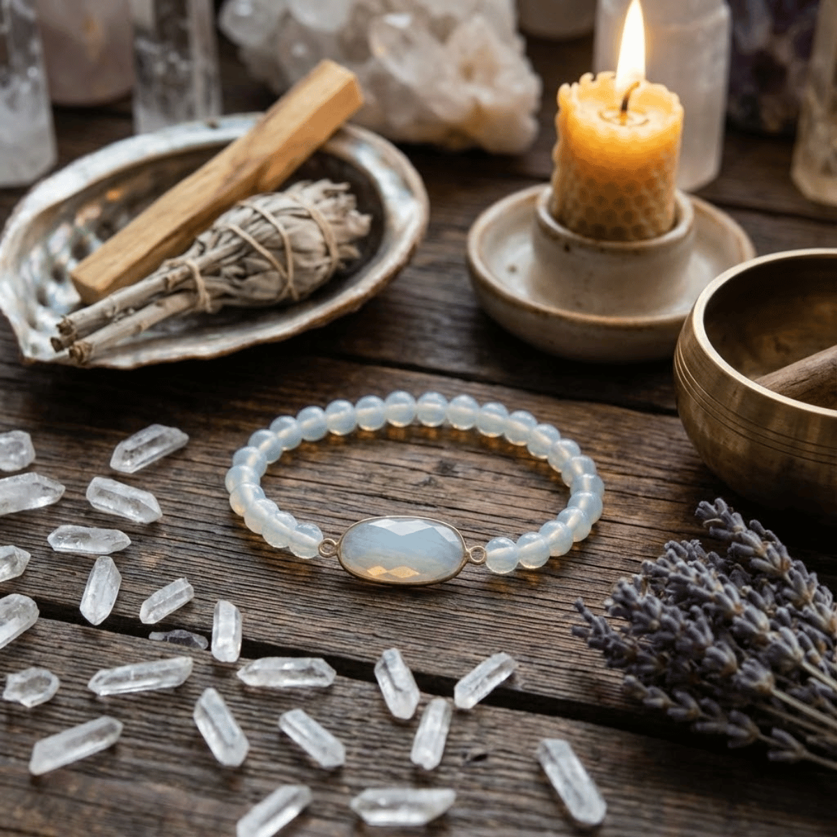 Najciekawsza praca odbywa się tu na poziomie Czakry Gardła. Choć opalit często kojarzony jest z czakrami górnymi, jego błękitne refleksy doskonale rezonują z ośrodkiem mowy. W tym profilu bransoletka pomaga wyrażać emocje w sposób spokojny i wyważony. Jeśli stres sprawia, że „zaciska Ci gardło” lub brakuje Ci słów – duży, centralny kamień zadziała jak kojący kompres. Pomoże Ci wypowiedzieć to, co czujesz, bez lęku i bez zbędnych nerwów.