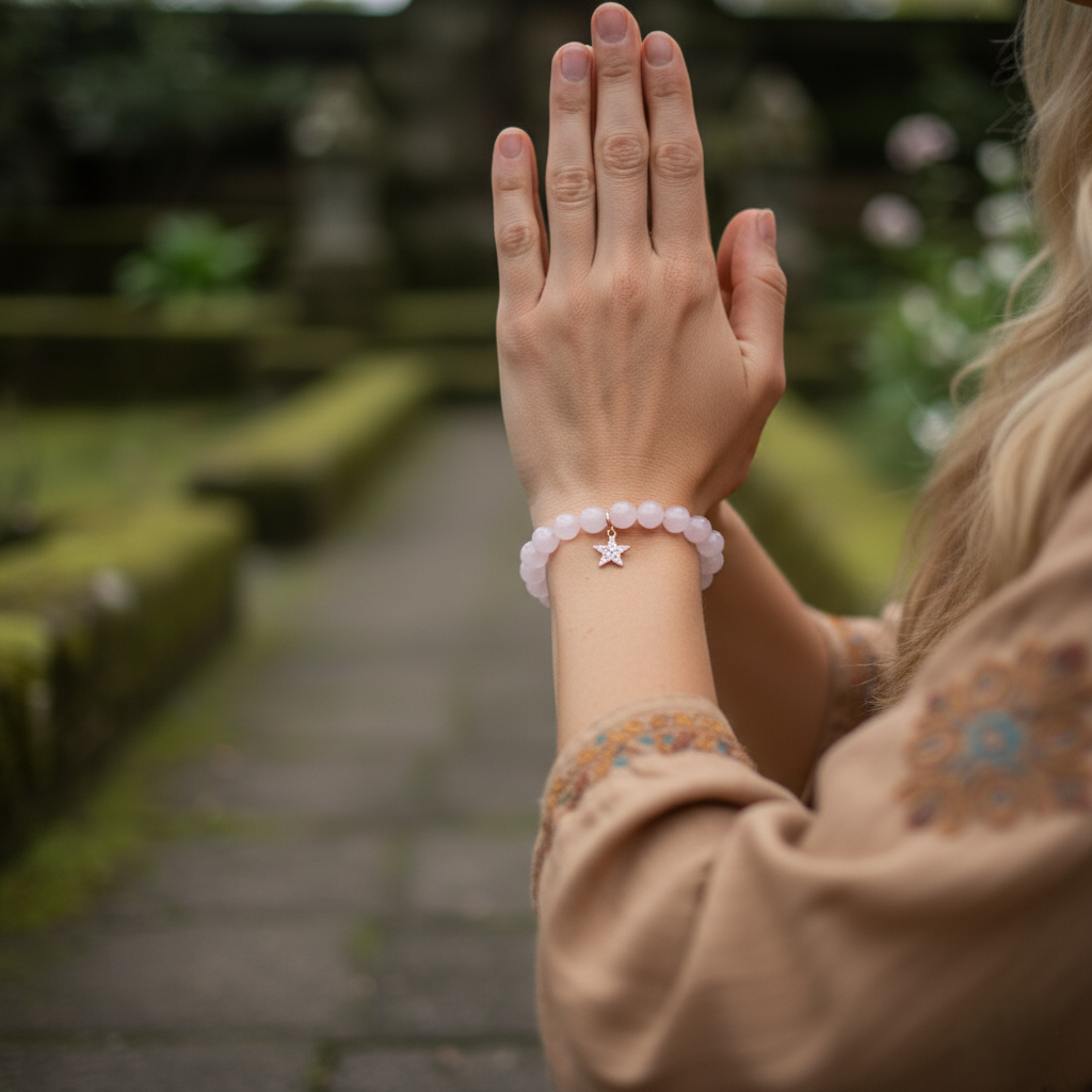 Ta urocza bransoletka, wykonana z różowego kwarcu i ozdobiona gwiazdką w złotym kolorze, to doskonały wybór dla osób, które cenią sobie biżuterię o głębokim duchowym znaczeniu i subtelnym pięknie. Różowy kwarc, nazywany kamieniem miłości, jest ceniony za swoje właściwości wspierające emocjonalne uzdrowienie, otwieranie serca oraz wprowadzanie harmonii w relacjach międzyludzkich. Jego delikatny, różowy kolor emanuje ciepłem, łagodnością i spokojem, co czyni go idealnym kamieniem dla osób pragnących wprowadzić do swojego życia więcej miłości i zrozumienia.