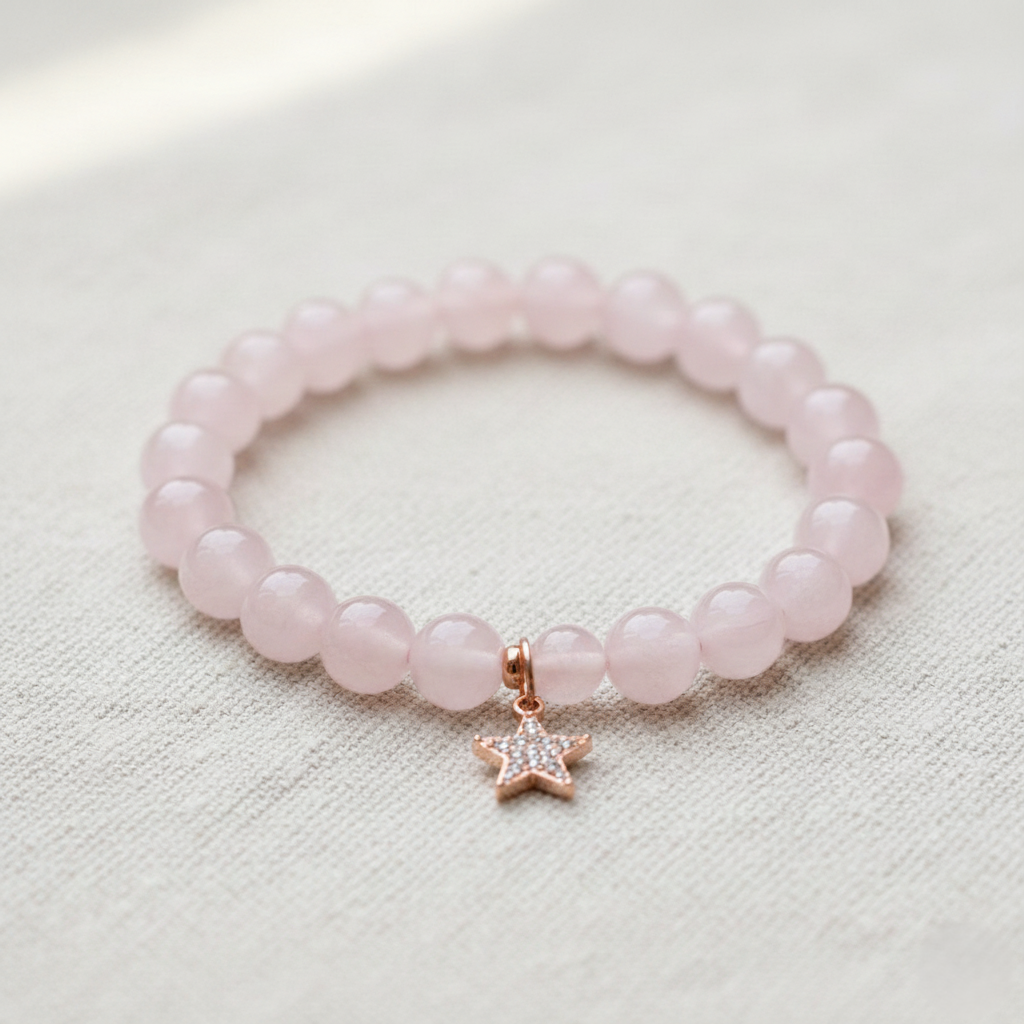 Bransoletka z różowego kwarcu ze złotą gwiazdką