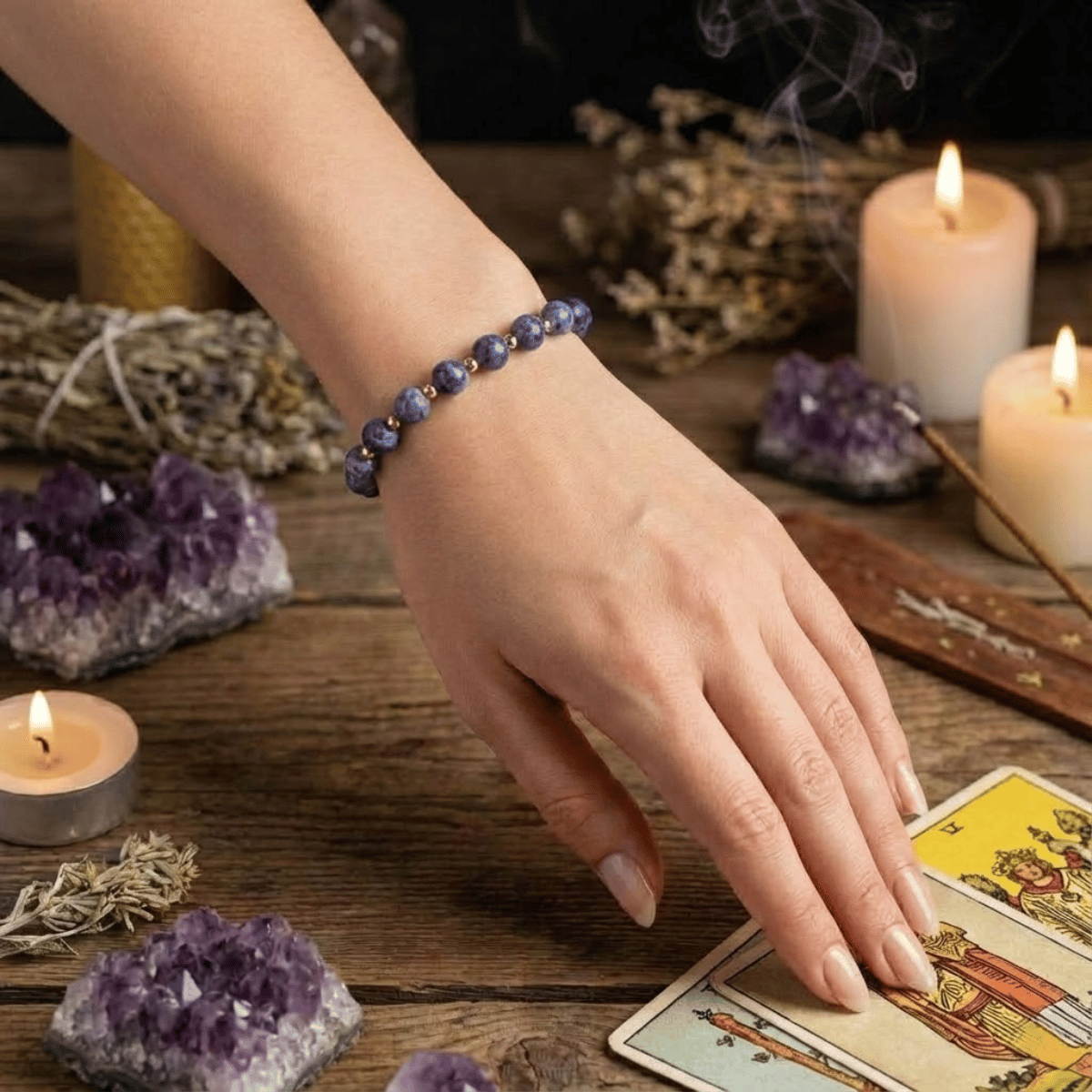 Jeśli pracujesz z Tarotem, kartami anielskimi lub runami, ta bransoletka powinna stać się Twoim nieodłącznym atrybutem. Zakładaj ją na rękę, którą tasujesz lub wybierasz karty. Sodalit zadziała jak „tłumacz” symboli – sprawi, że znaczenie rozkładu pojawi się w Twojej głowie natychmiast, bez zbędnego analizowania. To biżuteria dla Wiedźmy, która wie, że największa magia kryje się w jasności umysłu.