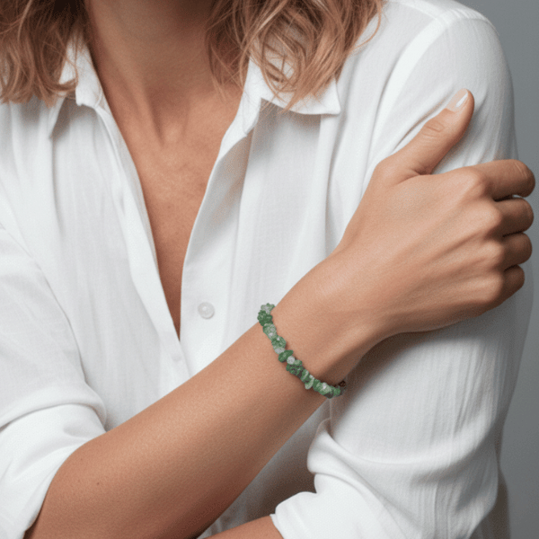 Elegancka bransoletka wykonana z zielonego awenturynu, charakteryzująca się surowymi, nieregularnymi kształtami kamieni, które przyciągają wzrok swoją naturalną teksturą i kolorystyką.