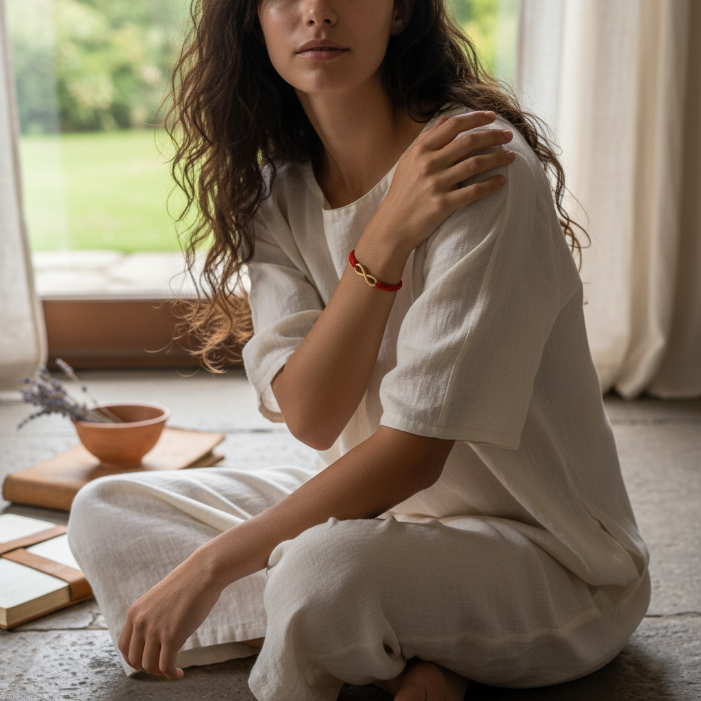 Czerwona sznurkowa bransoletka z symbolem nieskończoności to subtelny, a jednocześnie potężny talizman. Symbol nieskończoności oznacza bezgraniczną miłość, wieczną więź i harmonię, a intensywna czerwień chroni przed negatywną energią i przyciąga pomyślność. To biżuteria dla osób, które wierzą, że prawdziwe uczucia i energia dobra nigdy się nie kończą.