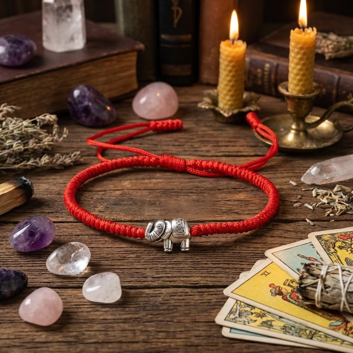 Niech słoń z trąbą w górę przyciąga do Ciebie szczęście, a czerwona nić chroni Twoją energię. Idź przez życie z lekkością i wiarą – pomyślność już jest w drodze.