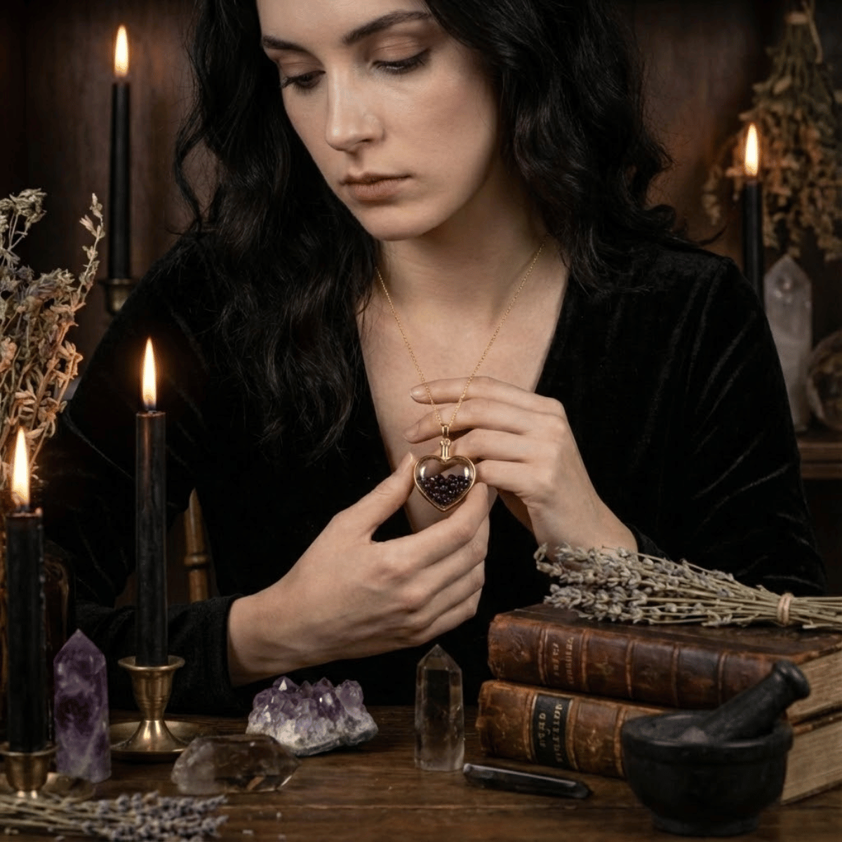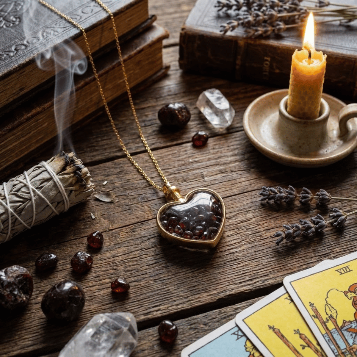 Ten naszyjnik to esencja zmysłowości i magnetyzmu. Szklane serce w złotej ramie wypełnione jest drobnymi, półprzezroczystymi okruchami Czerwonego Granatu. W świetle dnia wyglądają jak nasiona owocu granatu – symbolu płodności i bogactwa, a wieczorem nabierają tajemniczej, bordowej głębi. To talizman dla Kobiety świadomej swojej mocy, która szuka biżuterii podkreślającej jej kobiecość, charyzmę i wewnętrzny ogień.