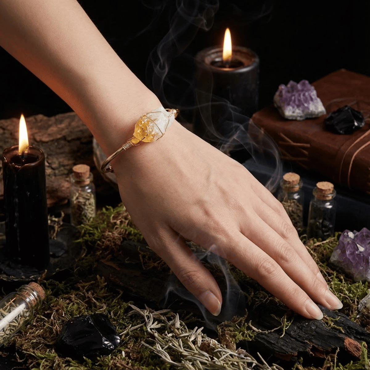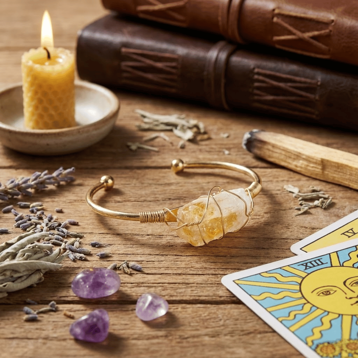 Ta bransoletka to manifestacja czystego sukcesu. W jej centrum lśni surowa, nieoszlifowana bryła naturalnego Cytrynu, opleciona złotym drutem niczym koroną. To biżuteria dla Kobiety, która zna swoją wartość i nie boi się sięgać po to, co najlepsze. Jest jak promień słońca zastygły w materii – ciepła, radiantna i nasycona energią bogactwa.