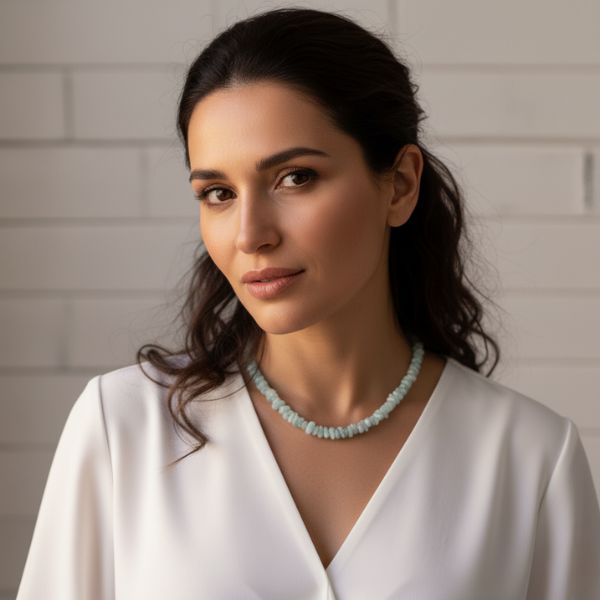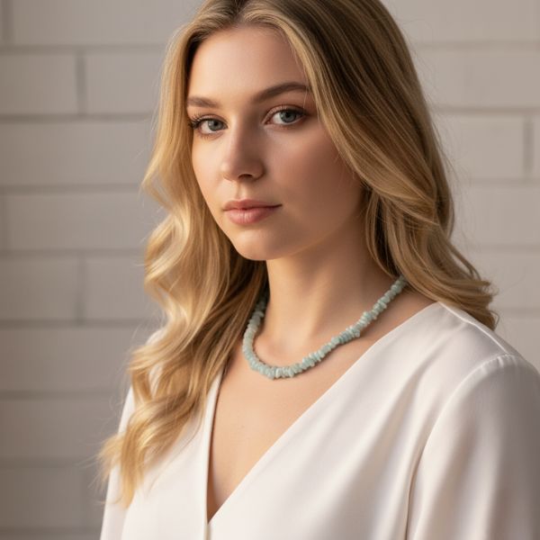 Dzięki swojemu chłodnemu, pastelowemu odcieniowi naszyjnik pięknie komponuje się z jasnymi i neutralnymi stylizacjami, dodając im lekkości i klasy. Dodaje delikatnej elegancji, a jego uniwersalność sprawia, że możesz nosić go samodzielnie lub zestawiać z innymi kamieniami, w zależności od intencji i nastroju. Idealny zarówno na co dzień, jak i na wyjątkowe okazje.