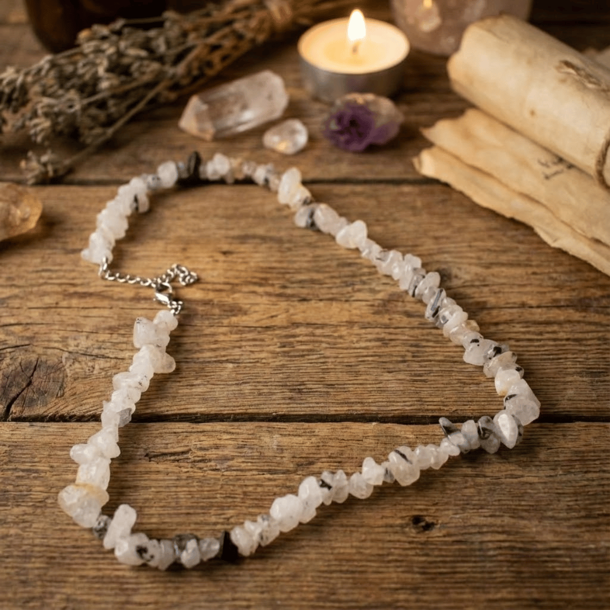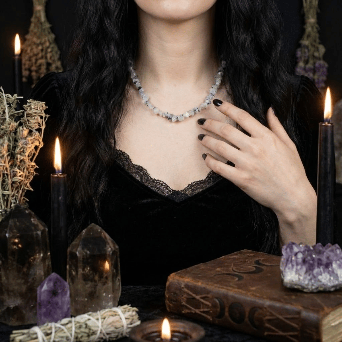 Ten naszyjnik to esencja równowagi Yin i Yang. Wykonany z surowych kawałków Kwarcu z czarnymi wrostkami (rutylem), wygląda jakby Natura zamknęła w krysztale drobne igły, mapy lub zapisy prastarej wiedzy. To biżuteria dla Kobiety Świadomej, która wie, że prawdziwa siła płynie z integracji tego, co w nas jasne, z tym, co trudne i ukryte. Jest surowy, nowoczesny i hipnotyzujący.