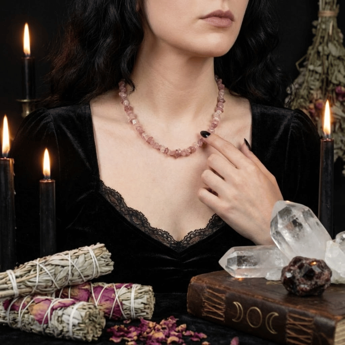 Ten naszyjnik to energia radości, którą możesz ubrać. Wykonany z surowych kawałków Kwarcu Truskawkowego, zachwyca unikalną strukturą – wewnątrz półprzezroczystych kamieni tańczą drobinki tlenku żelaza, które wyglądają jak nasionka truskawki lub iskry ognia. To talizman dla Kobiety, która kocha życie, chce czerpać z niego przyjemność i nie boi się pokazać światu swojej spontanicznej, dziewczęcej natury.