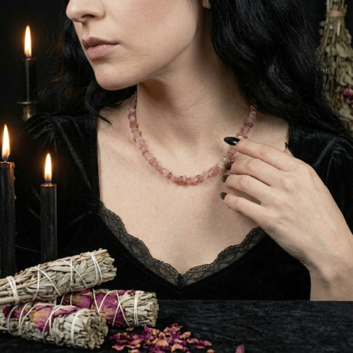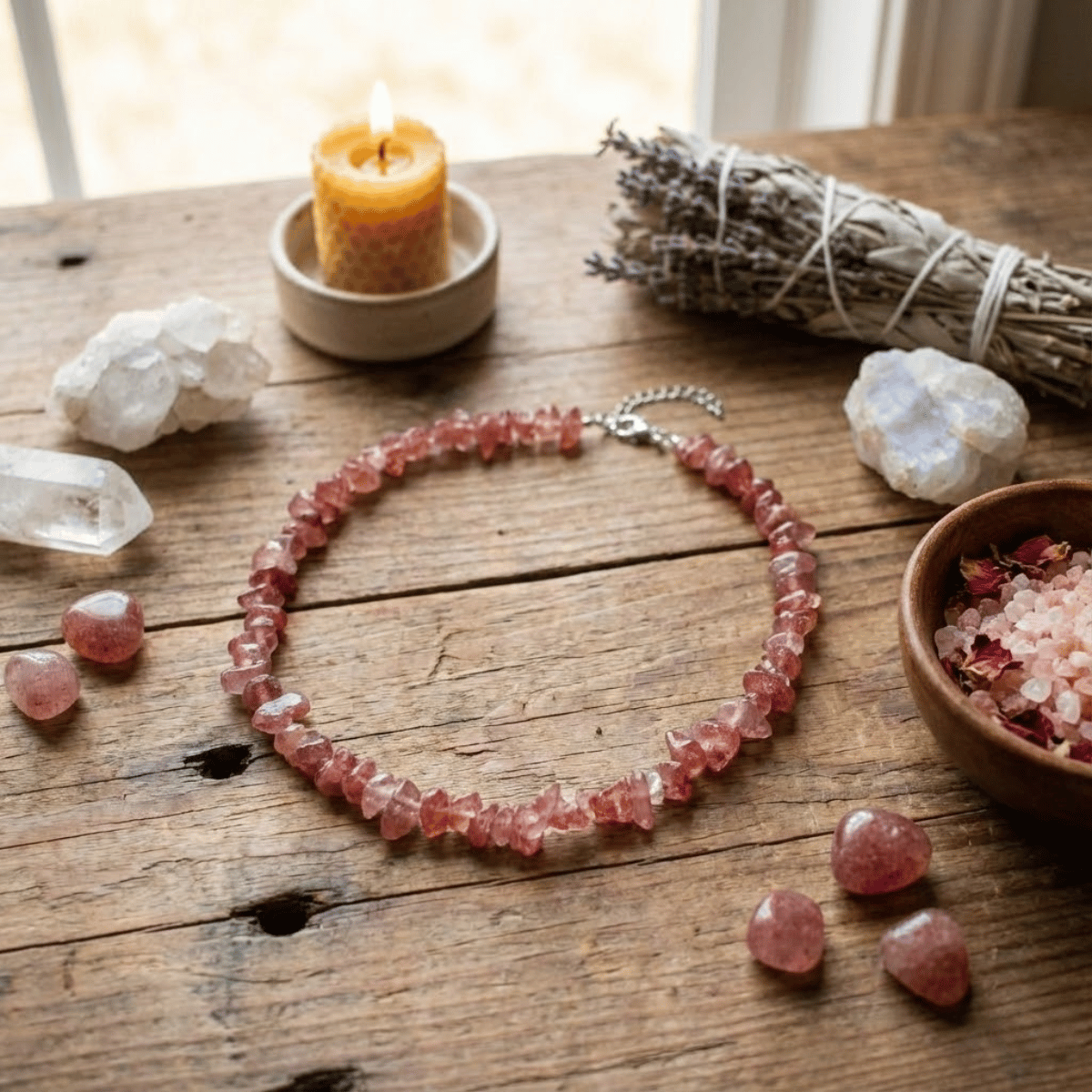 Traktuj ten naszyjnik jak energetyczny prysznic o zapachu lata. Kiedy czujesz, że atmosfera wokół Ciebie gęstnieje, że dopada Cię smutek lub stres – dotknij tych nakrapianych kamieni. Pozwól, by ich wibracja „wypłukała” z Ciebie ciężar. Kwarc Truskawkowy transformuje szarość w kolor, a lęk w ciekawość życia.
