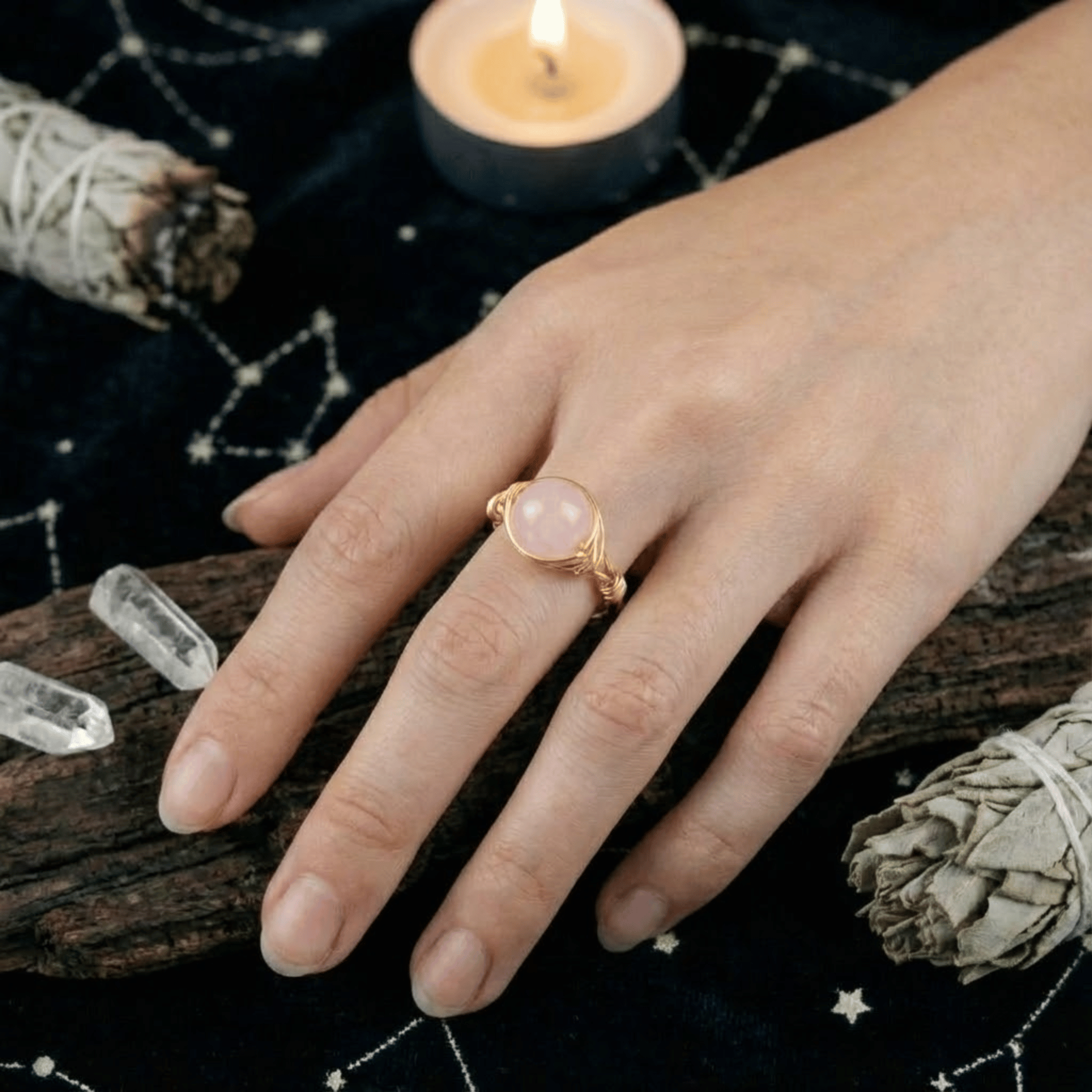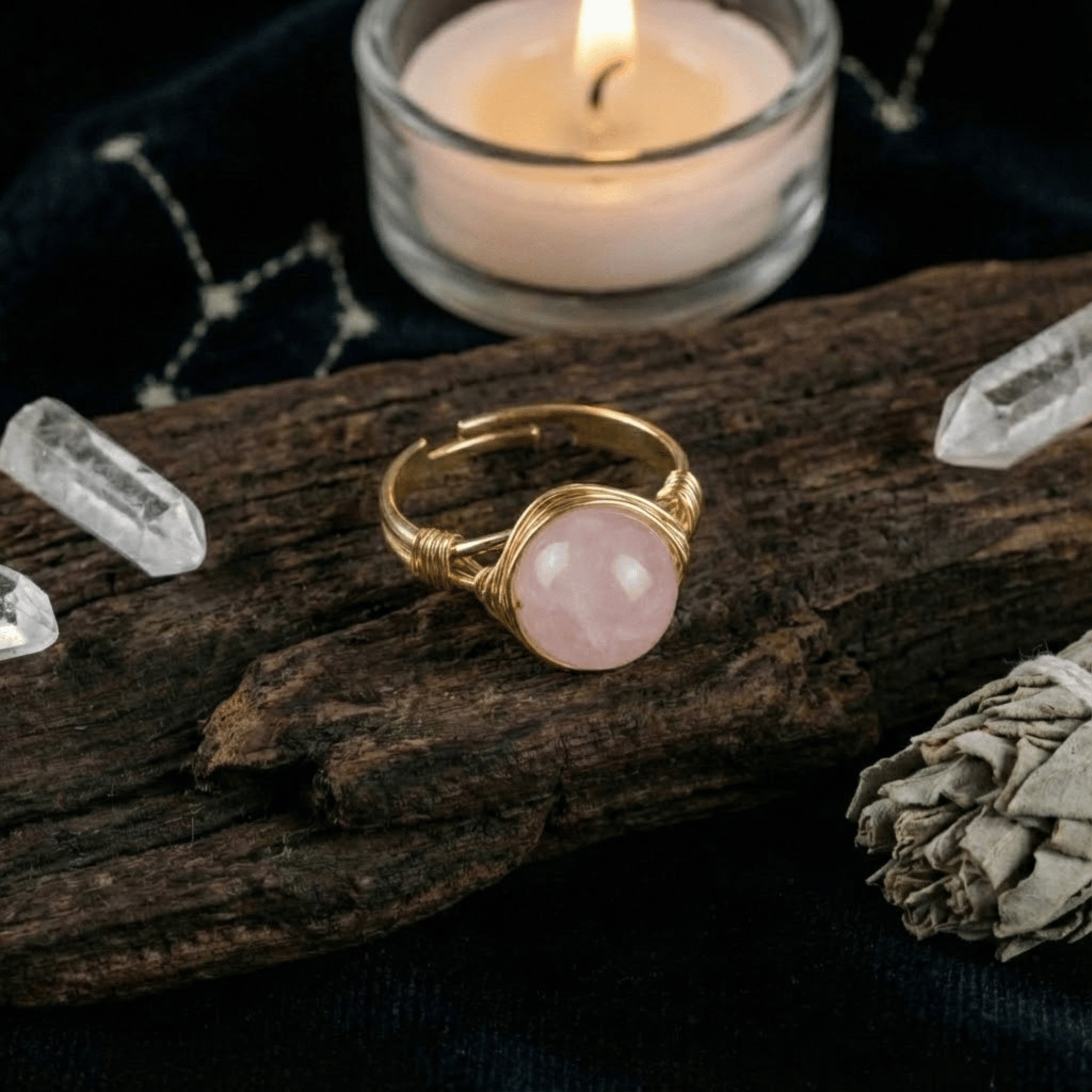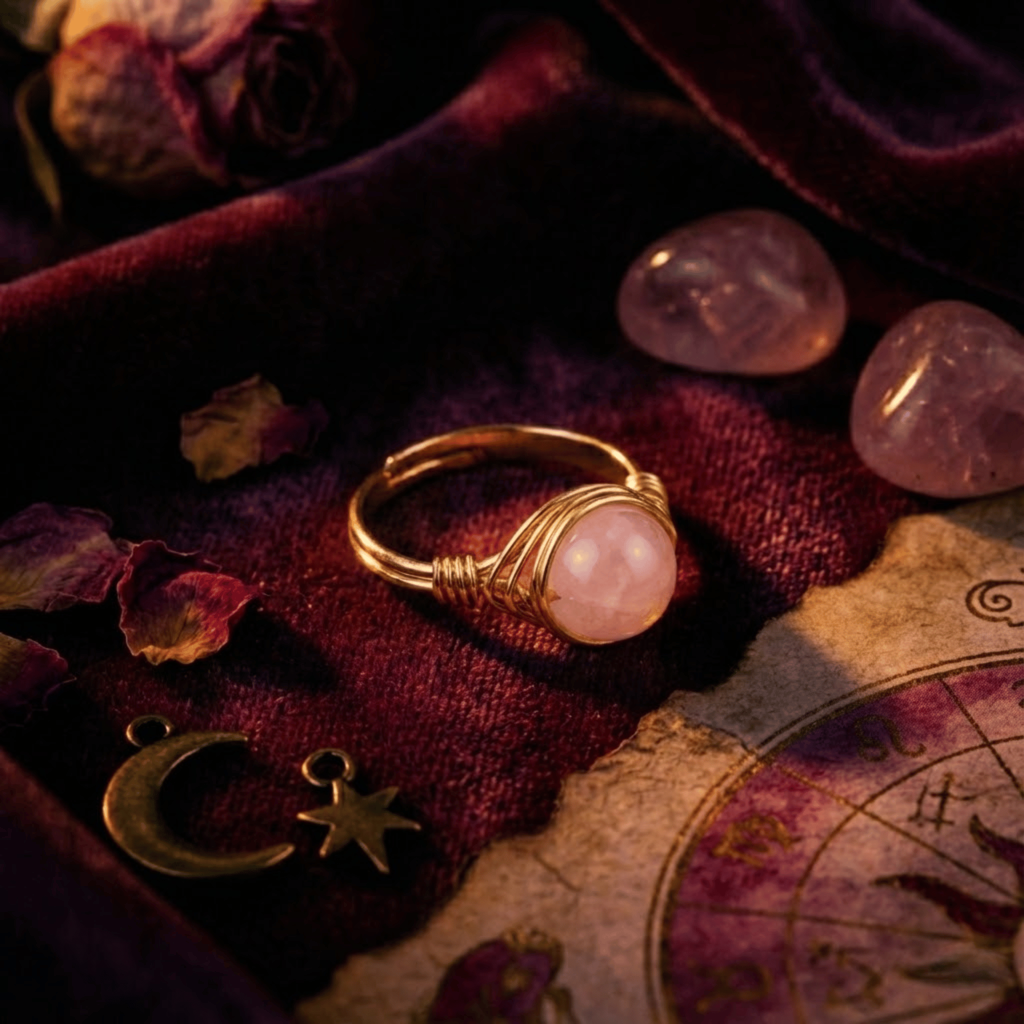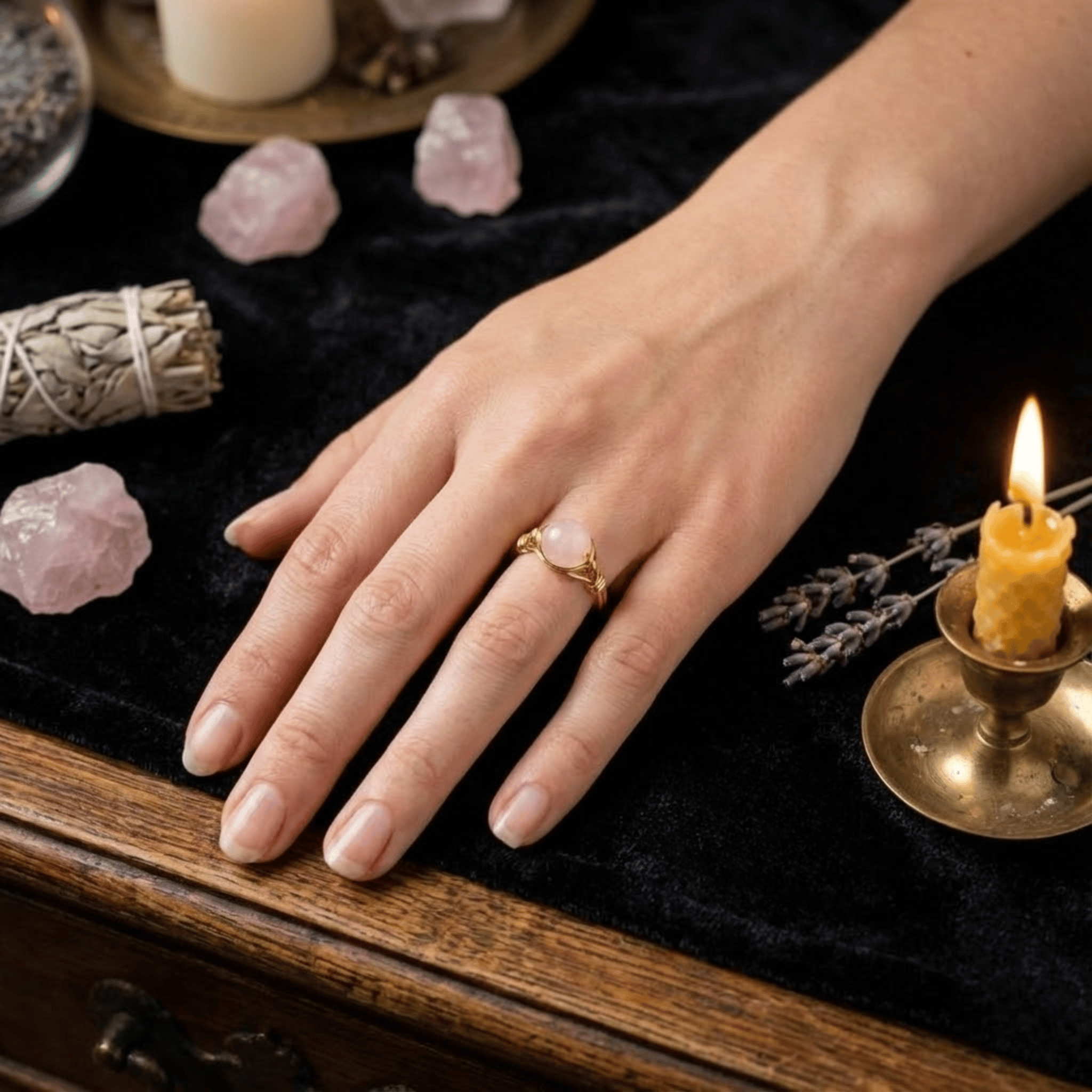 Ten pierścionek to subtelny manifest miłości własnej. W jego sercu spoczywa gładki, okrągły Różowy Kwarc – kamień, który od wieków uznawany jest za krystalizację czystego uczucia. Opleciony złotą nicią, wygląda jak kropla porannej mgły oświetlona wschodem słońca. Jest cichym przypomnieniem, byś w pędzie codzienności zatrzymała się na moment i była dla siebie dobra.