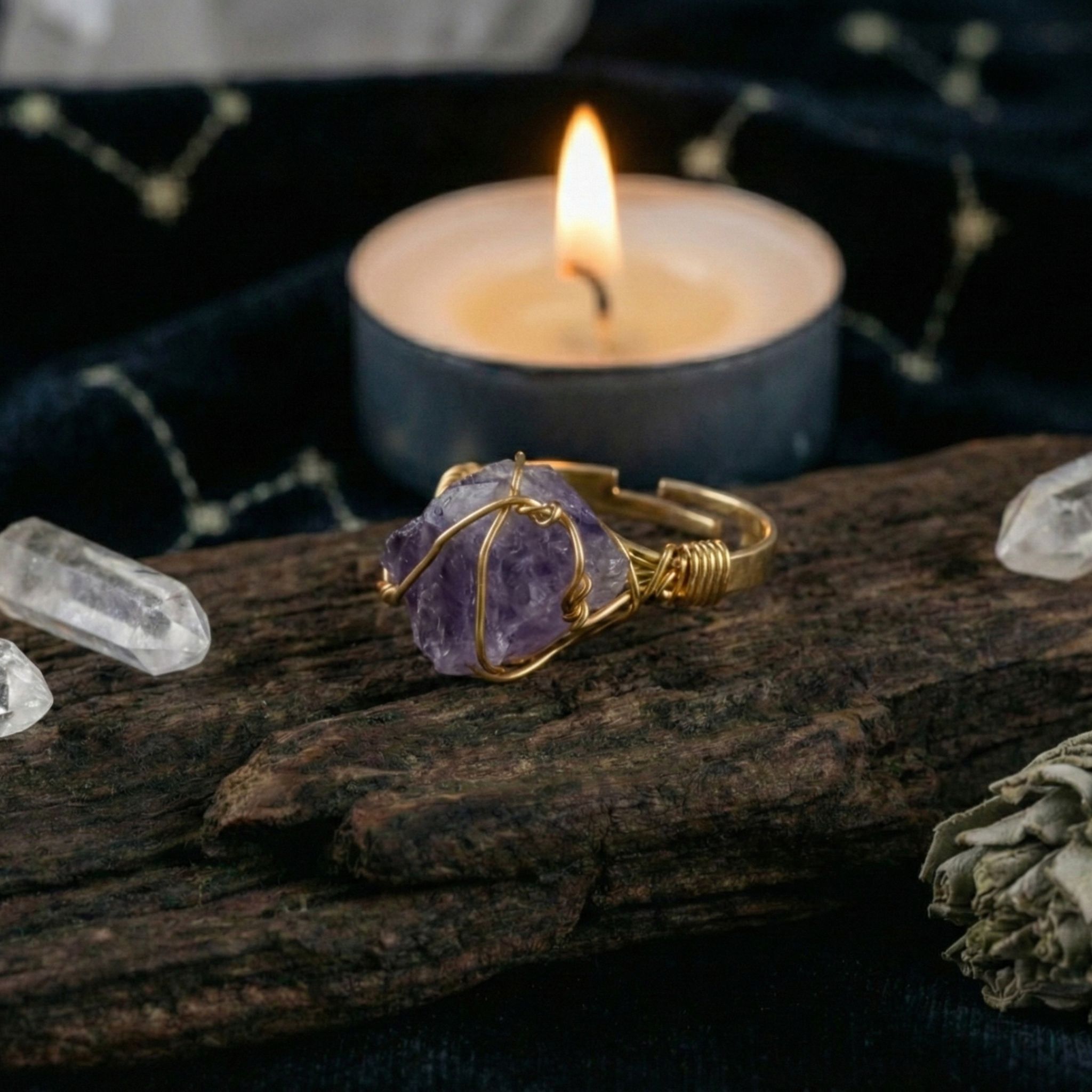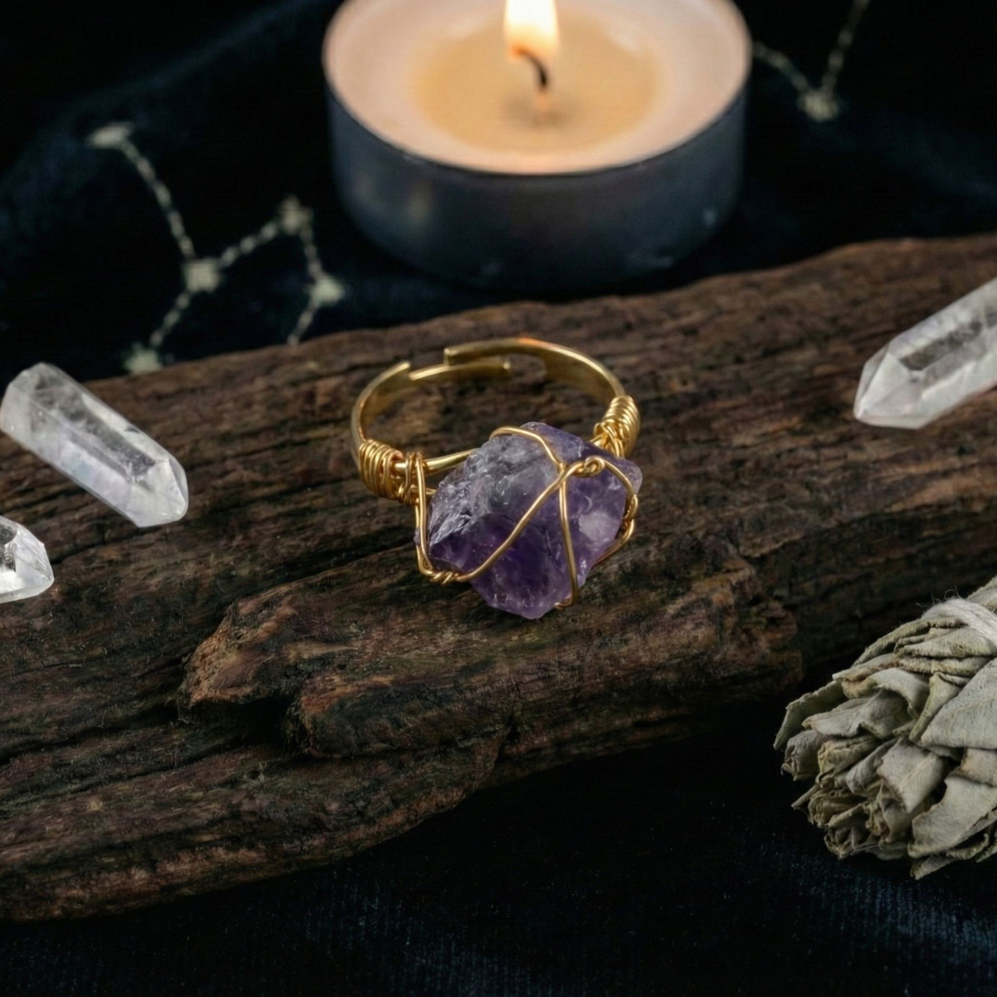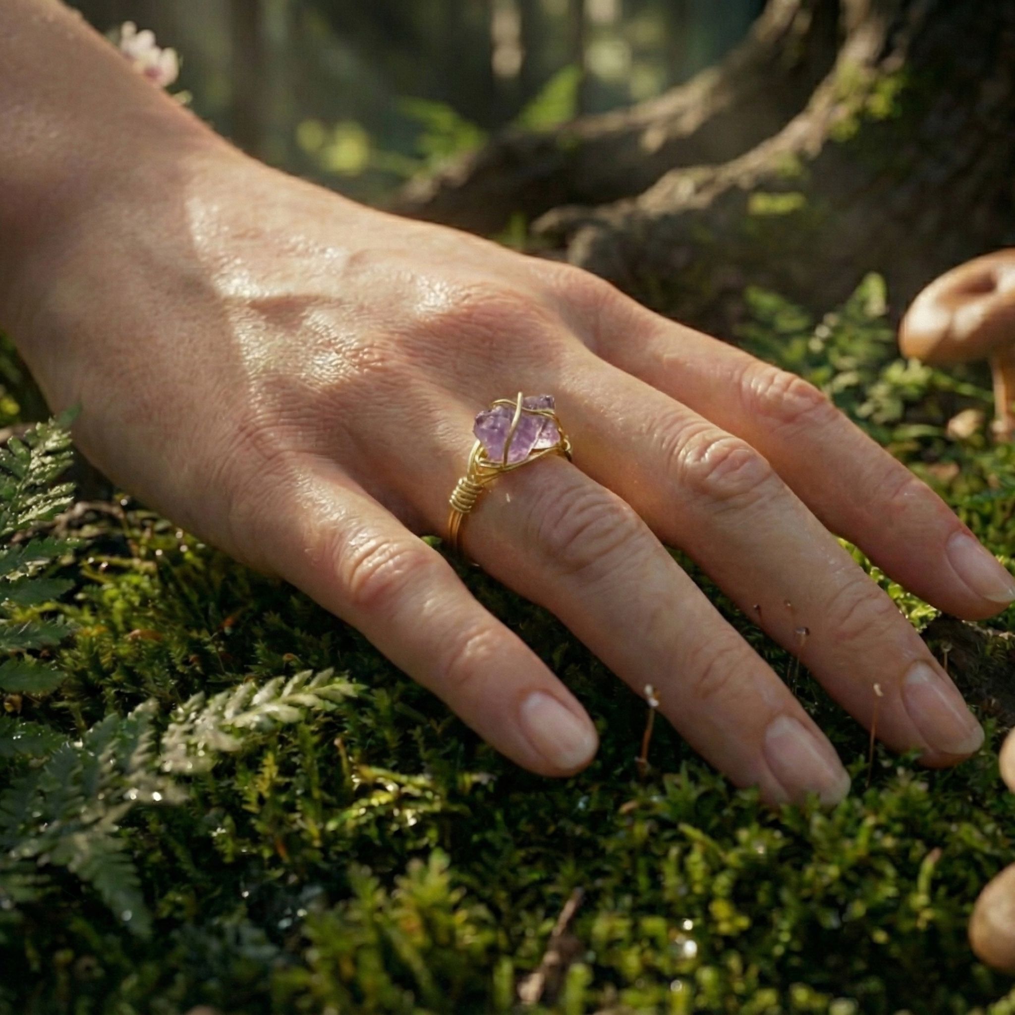 Ten pierścionek skrywa w sobie kawałek nocnego nieba – surowy, nieoszlifowany ametyst. Jego głęboki fiolet, mieniący się w słońcu niczym lawendowa mgła, został czule objęty złotym splotem. To biżuteria dla marzycielki, która stąpa twardo po ziemi, ale głowę trzyma w chmurach. Jest Twoim osobistym talizmanem ochronnym, który przypomina, że prawdziwa magia dzieje się wtedy, gdy zamykasz oczy i zaczynasz widzieć sercem.