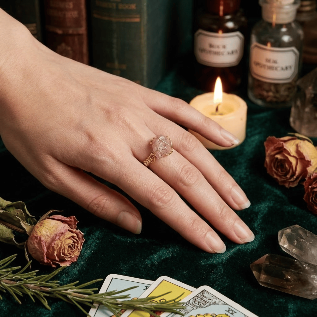 Ten pierścionek działa w zupełnie inny sposób, niż mogłaby sugerować jego „słodka” nazwa. W tej unikalnej konfiguracji, surowy kwarc truskawkowy nie służy tylko do odczuwania emocji, ale staje się potężnym filtrem mentalnym, strzegącym Twojej głowy.