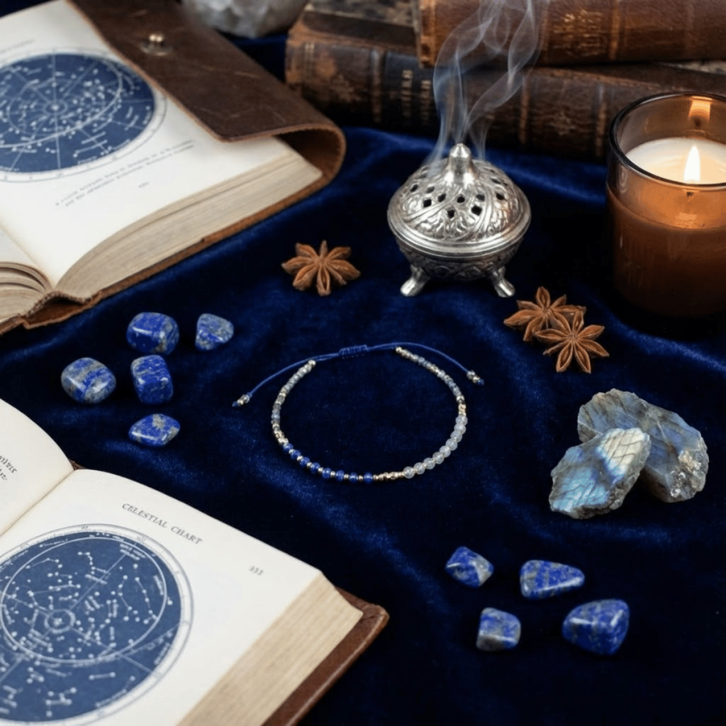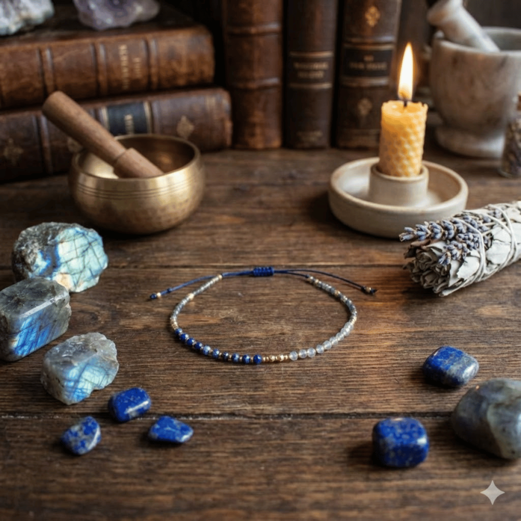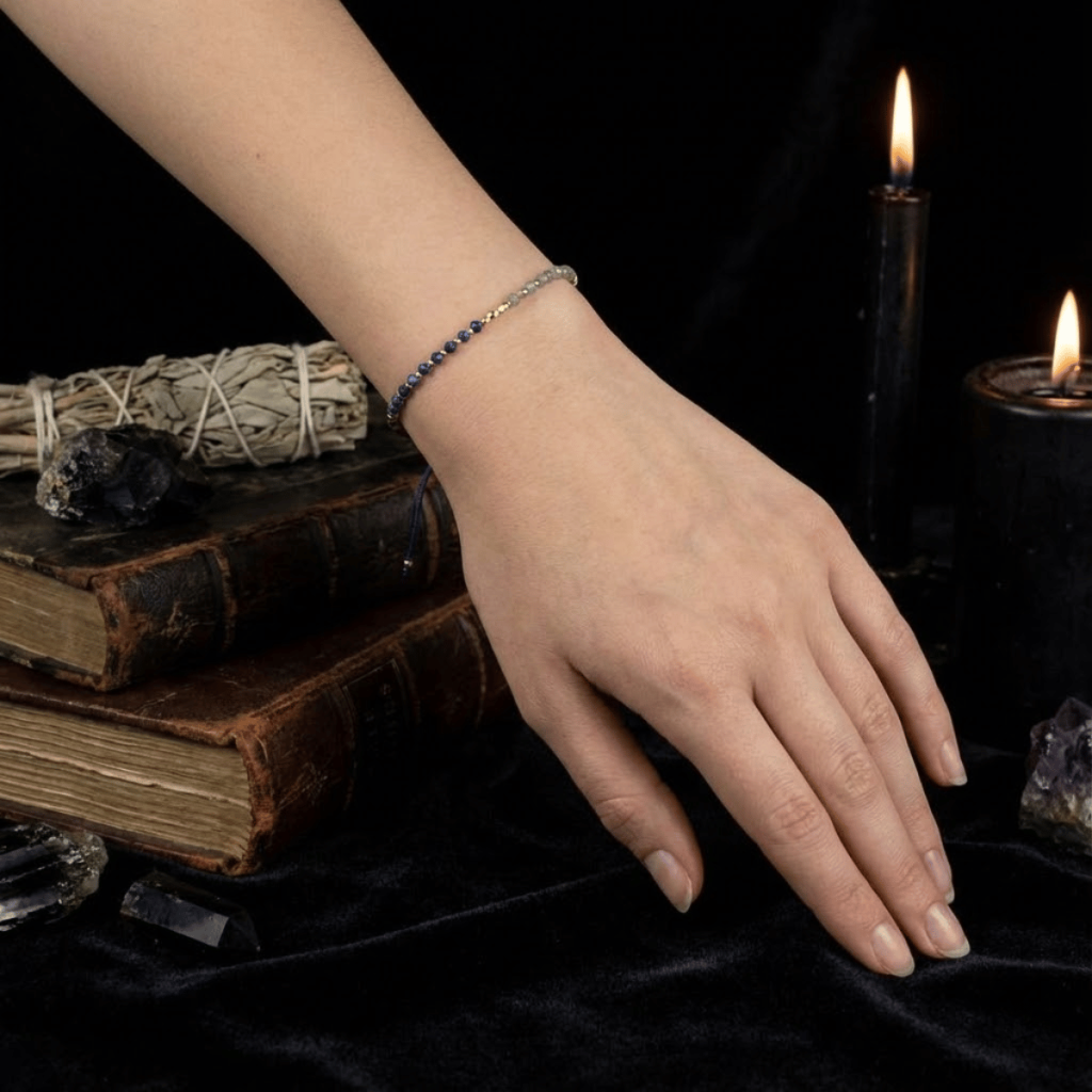 Serce tej bransoletki bije w rytmie Czakry Trzeciego Oka. To niezwykły duet: Lapis Lazuli otwiera „wewnętrzne oko”, pozwalając dostrzec ukryte znaczenia, podczas gdy Labradoryt działa jak magiczna tarcza, która filtruje wizje i chroni przed iluzjami. Drobne koraliki na niebieskim sznurku tworzą krąg, który wzmacnia jasnowidzenie i telepatię.