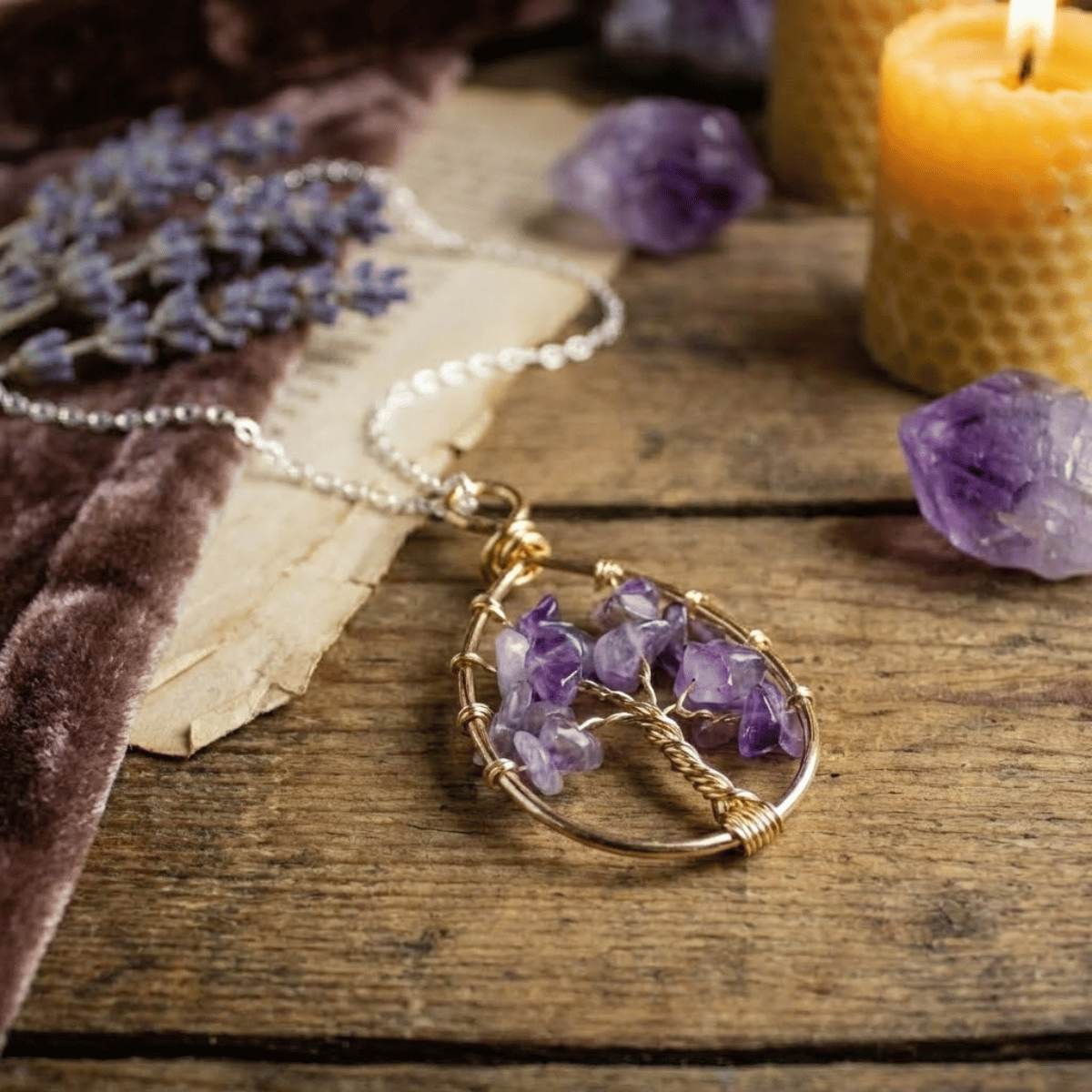 Ten naszyjnik na witalność został stworzony przy użyciu małych kawałków ametystu – niezwykle silnego minerału o wielu właściwościach. Dodatkowo wykorzystaliśmy w nim symbolikę drzewa życia, które również niesie ze sobą wiele znaczeń i energii.