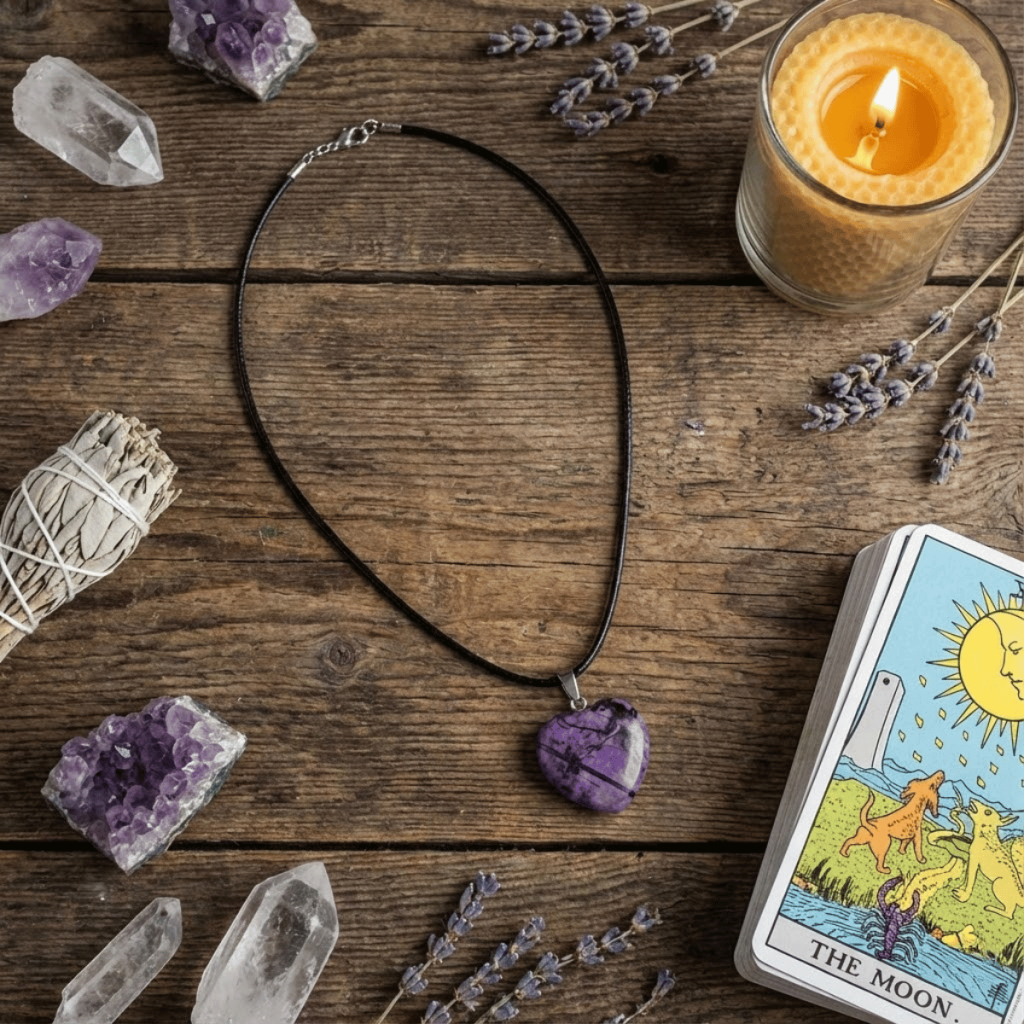 Twoja intencja skierowała energię prosto do Czakry Trzeciego Oka. To centrum Twojej wizji, jasnowidzenia i głębokiego poznania. Choć kształt serca odnosi się do uczuć, fioletowy kolor kamienia mapowego otwiera wrota do Twojej wyobraźni i duchowych wglądów. Kiedy Twoją intencją jest rozwój duchowy i praca z kartami, ten wisiorek działa jak „soczewka” dla Twojej intuicji. Rozprasza mgłę niepewności i pozwala Ci czytać znaki przesyłane przez wszechświat z niezwykłą klarownością. Pomaga „widzieć więcej” podczas rozkładów Tarota czy wyroczni, sprawiając, że Twoje interpretacje stają się głębokie i trafne.