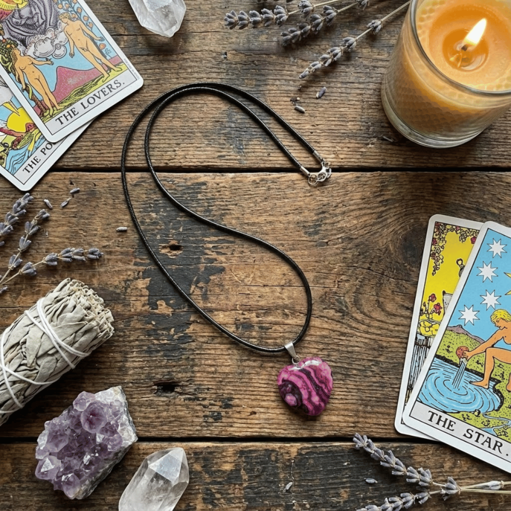 Zawieszka w kształcie serca, w połączeniu z różowym kamieniem, podkreśla znaczenie miłości, ochrony i duchowego wsparcia. Noszenie tego naszyjnika może przypominać o potrzebie dbania o swoje emocje i relacje, dodając otuchy i radości w trudniejszych chwilach.