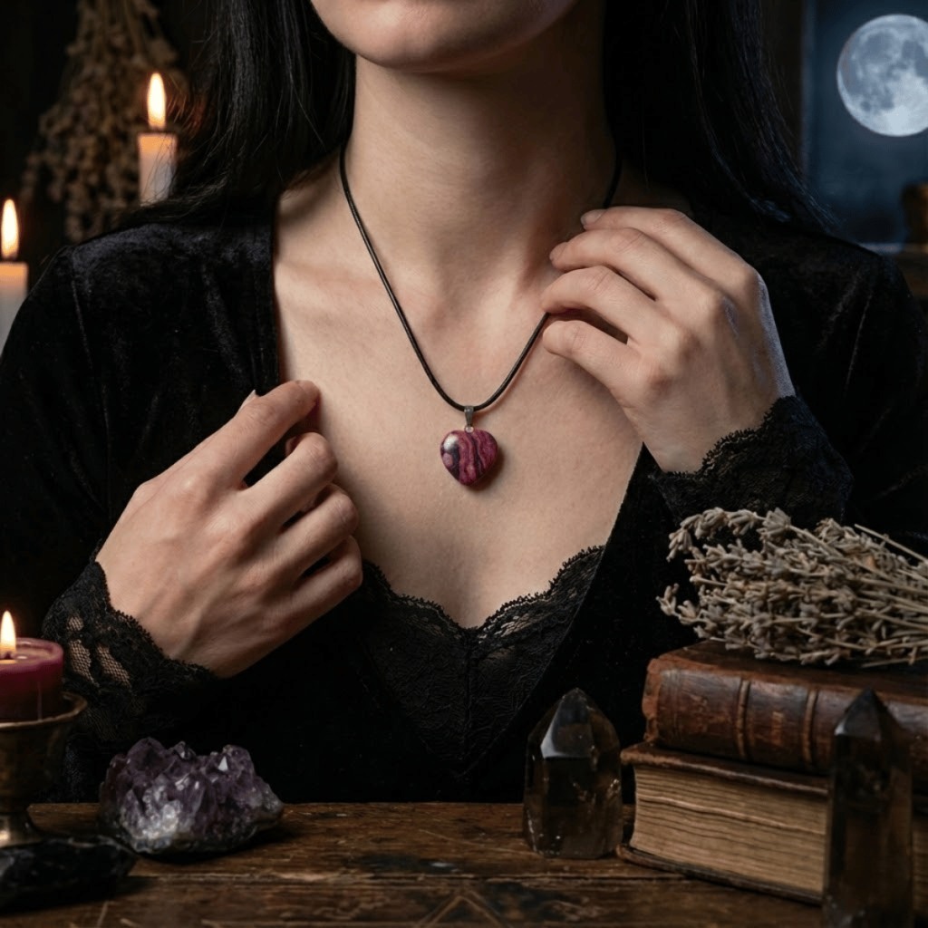 Ten niezwykły amulet to połączenie delikatności symbolu serca z surową, prastarą siłą natury. Wykonany z różowego kamienia mapowego, zachwyca unikalnym rysunkiem ciemniejszych pasm i inkluzji, które przypominają ścieżki przeznaczenia wymalowane na kamiennej mapie. To biżuteria dla Kobiety, która szuka w życiu balansu, pragnie pielęgnować w sobie radość i potrzebuje talizmanu, który będzie przypominał jej o sile jej własnych emocji.