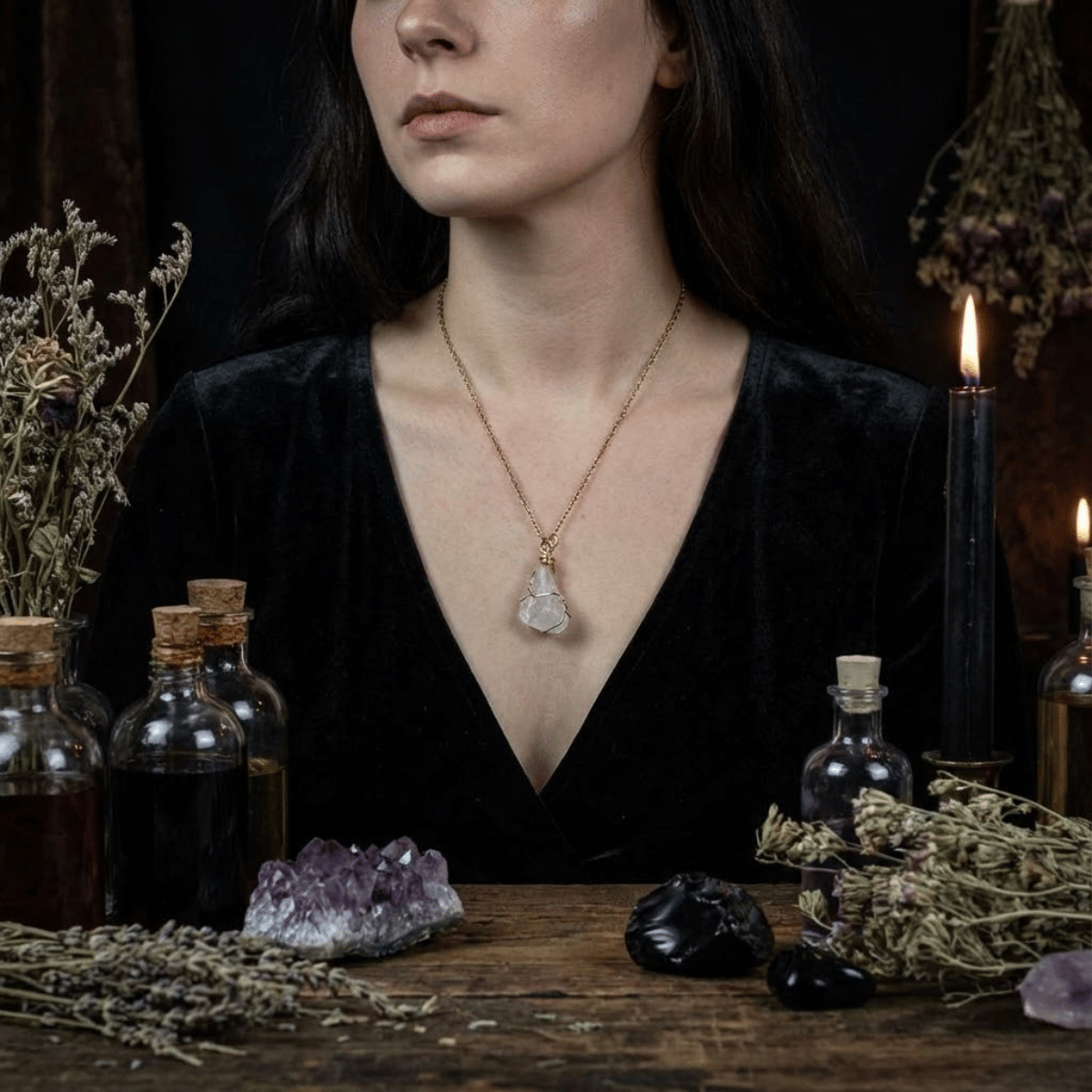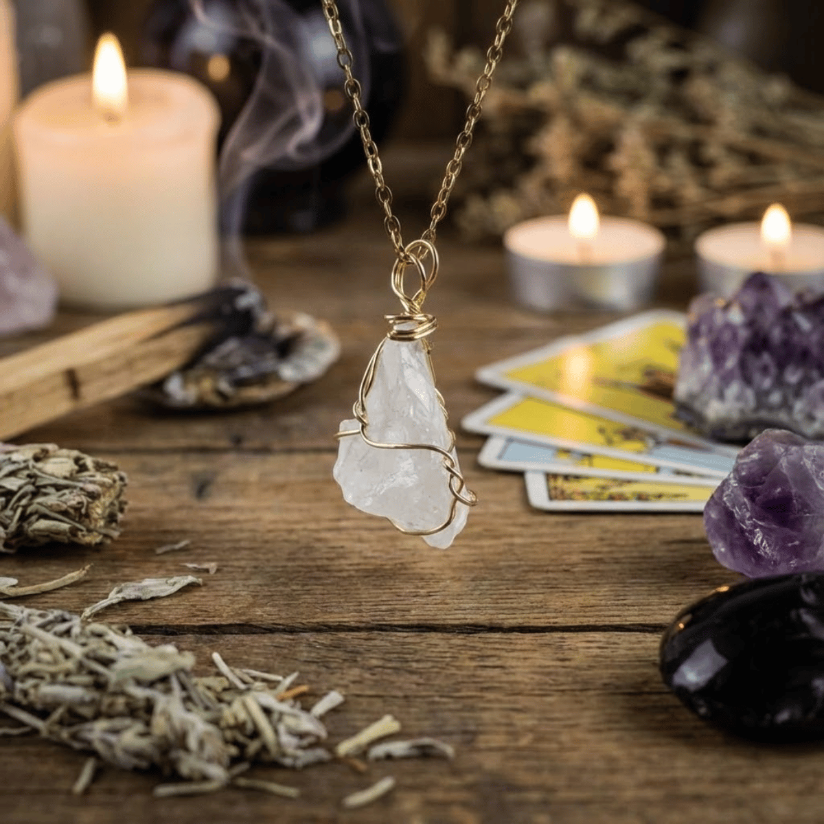 Ten wisiorek to esencja jasności. Wygląda jak kawałek lodu, który nigdy się nie topi, lub jak skrystalizowany promień słońca. To surowa, nieoszlifowana bryłka Kryształu Górskiego, opleciona złotym drucikiem, tworząca małą, magiczną wieżę. Jest to talizman dla Kobiety, która szuka prawdy, potrzebuje oczyścić głowę z natłoku myśli i pragnie połączyć się ze swoją najwyższą intuicją.