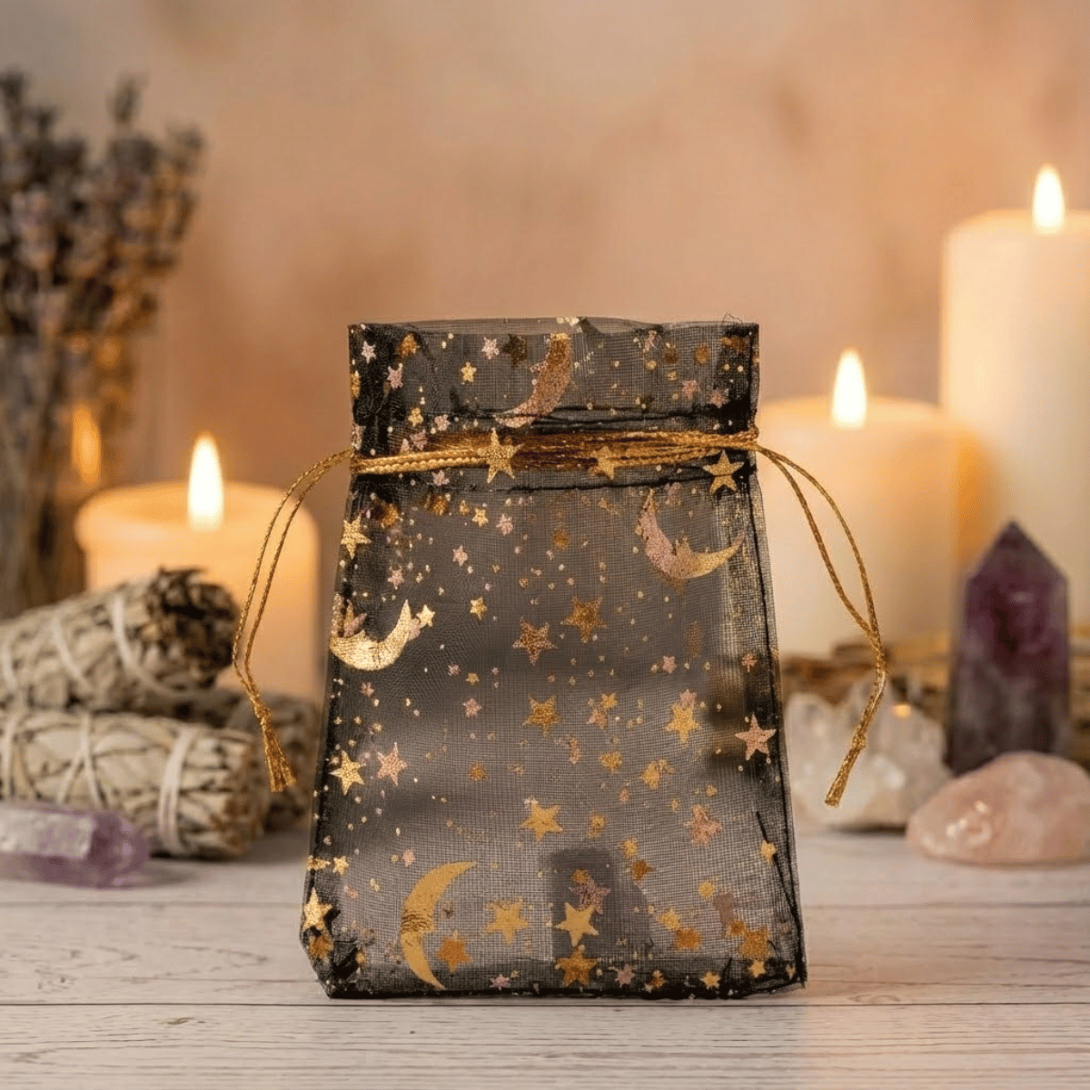 Elegancki woreczek z organzy w czarno-złotej kolorystyce z motywem gwiazd i księżyców. Idealny do pakowania biżuterii, amuletów, drobnych prezentów oraz produktów ezoterycznych. Lekki, estetyczny i trwały.