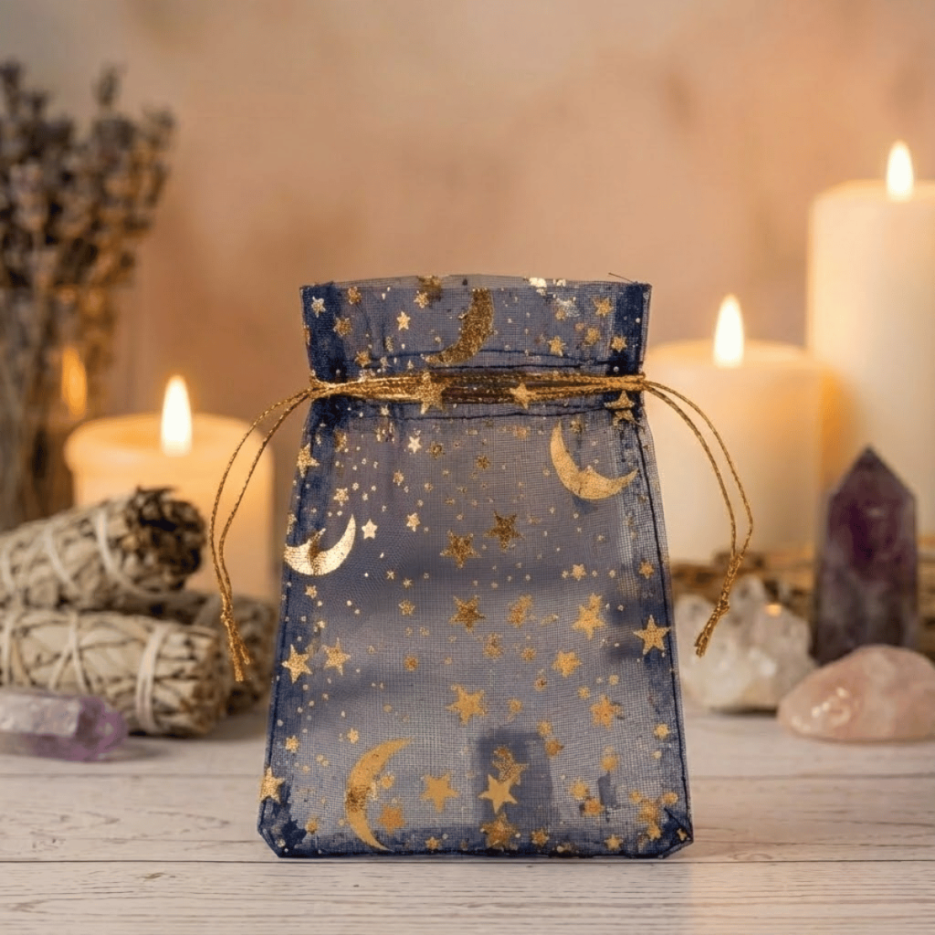 Elegancki woreczek z organzy w granatowo-złotej kolorystyce z motywem gwiazd i księżyców. Idealny do pakowania biżuterii, amuletów, drobnych prezentów oraz produktów ezoterycznych. Lekki, estetyczny i trwały.