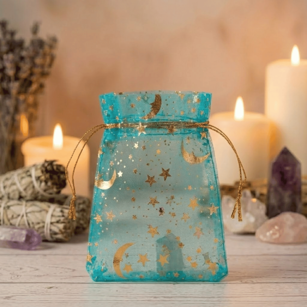 Elegancki woreczek z organzy w turkusowo-złotej kolorystyce z motywem gwiazd i księżyców. Idealny do pakowania biżuterii, amuletów, drobnych prezentów oraz produktów ezoterycznych. Lekki, estetyczny i trwały.